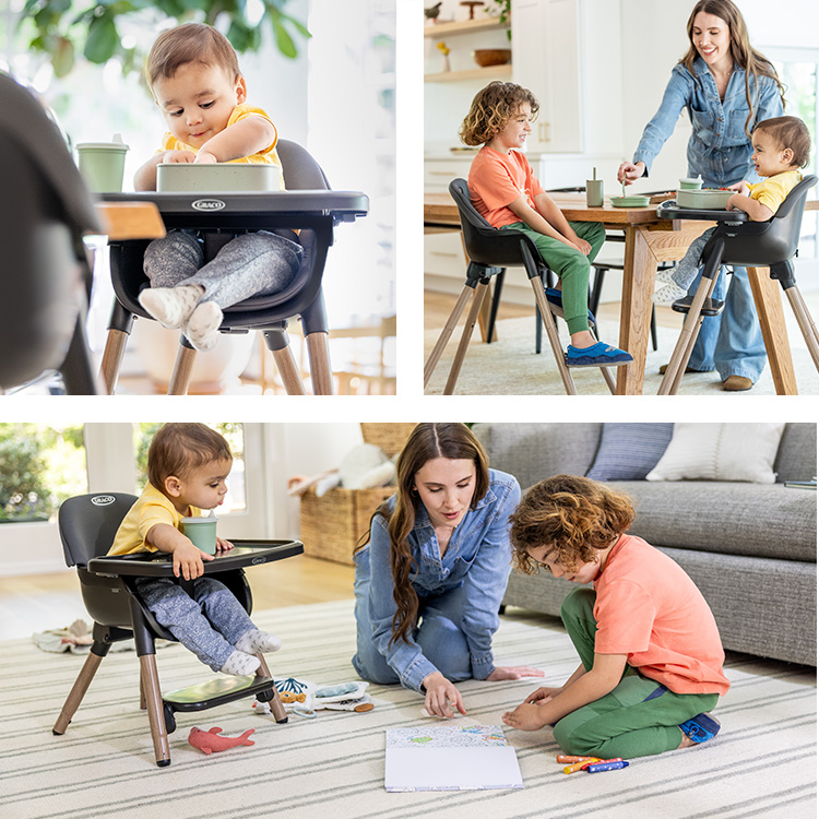 - Mod scaun jos (6 luni – 3 ani, 15 kg): Perfect pentru gustari sau timp de joaca, permitand copilului sa fie aproape de masa fara a fi prea sus.