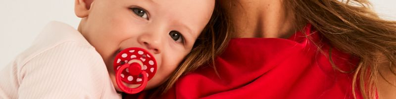 Suzetele Polka Dots sunt disponibile cu tetina rotunda in latex natural, dar si in varianta anatomica in culorile selectate. Colectia include si o cutie eleganta pentru suzeta si un clips cu buline, pentru un look complet de la prima zi.