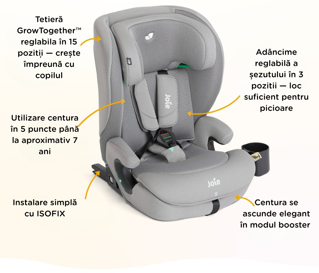 Pentru familiile care isi doresc un singur scaun care sa acopere toate etapele, de la toddler pana la copil mare, Joie i-Irvana Max este una dintre cele mai complete si inteligente optiuni.